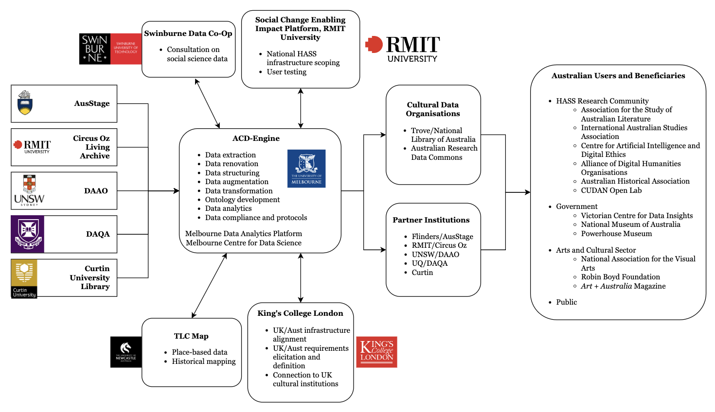In terms of personnel, the ACD-Engine was comprised of a core team at the University of Melbourne and collaborators at institutions around Australia, summarised as follows: