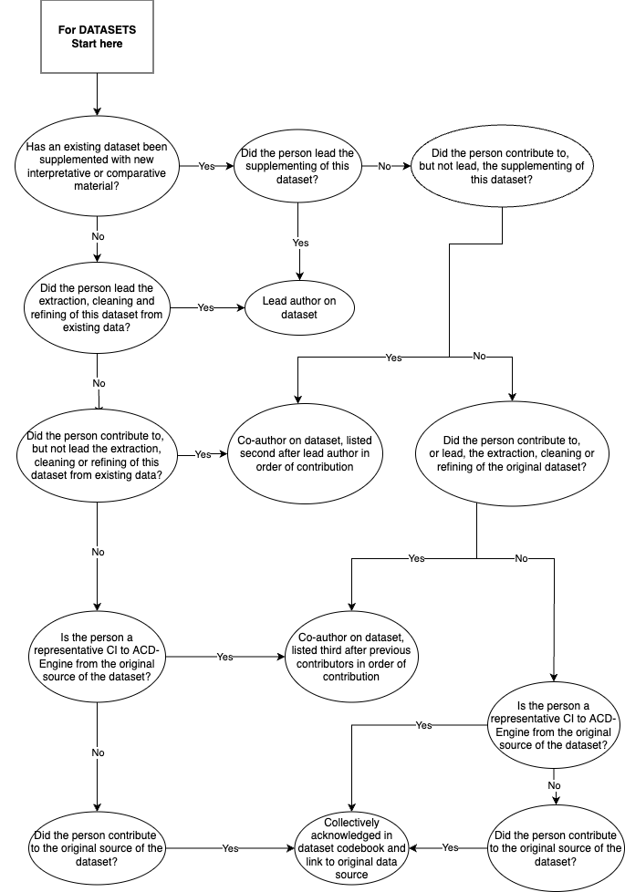 With these concerns in mind, we sought to develop a data-sharing agreement that outlined a pipeline for recognition of contributors to ACD-Engine datasets and collaborative papers, as well as a model for citation of data sources, that would adhere to recently released recommendations from the Australian Research Council for authorship of collaborative publications. After surveying the existing literature and participating in an Australian Research Data Commons laboratory on this topic, it became clear that most projects share general principles, but there was no well-established data sharing policy standard that would meet our needs. Our final data sharing policy, one component of which is represented in the visual summary below, has enabled us to rapidly determine responsibilities for work outputs and to appropriately assign authorship and acknowledge additional contributors.