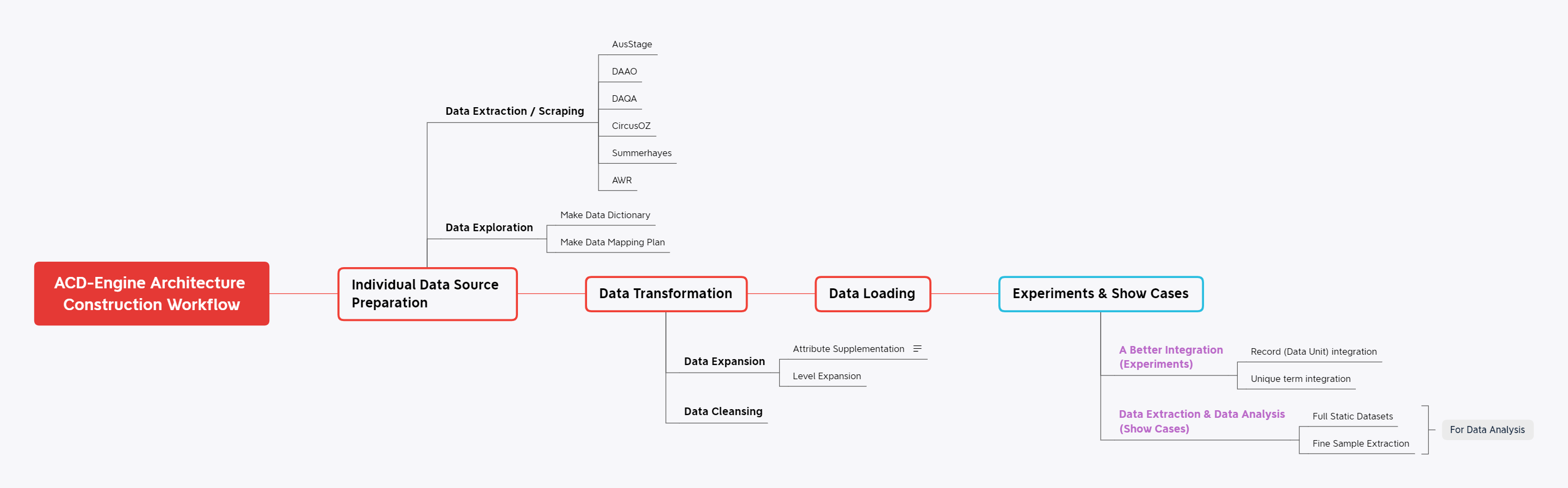 This article contributes to a growing genre of scholarship about collaborative research design within the digital humanities, including 1 2. Writing from a cross-disciplinary perspective, in this article we describe the project’s objectives, design, and multi-stage approach to the extraction, aggregation, and analysis of a wide range of cultural data. Reporting on the organisation of research design and activity has been standard practice in government and the commercial sector for decades and helps to establish standardised and stable frameworks for research 3. Continuing this developing best practice, we outline our project’s aims and objectives, contextualise these among some major national and international cultural data aggregation projects, and explain how we assembled our team. It was essential to establish principles for open data sharing among our project partners, so this process is also explained. As the central outcome of the project, we then provide a detailed overview of the ACD-Engine Architecture Construction Workflow that has resulted in the ACD-Engine information architecture prototype, as a significant contribution towards a national data architecture for Australian artistic and cultural collections. Developing from our work in data exploration and enrichment, we outline some cultural data outputs emerging from the ACD-Engine that illustrate how the discrete datasets developed by the project offer productive applications in humanities research, creative industries, and cultural policy. Finally, we summarise the project’s key outcomes and suggest possible future directions for the generation, interoperability, and application of Australian cultural data that might build upon the ACD-Engine’s work.