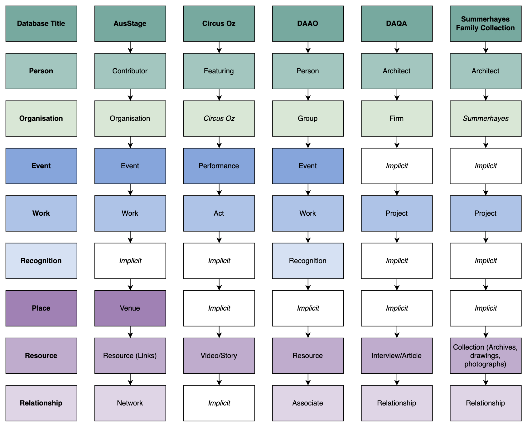 A simplified visualisation of the ACDEA, showing how differing entity titles are translated into our harmonised data structure. White rectangles indicate that the database does not explicitly recognise the entity in question, but that information on this entity is nonetheless available within. Circus Oz and Summerhayes are also italicised, being the only organisations in their respective datasets.